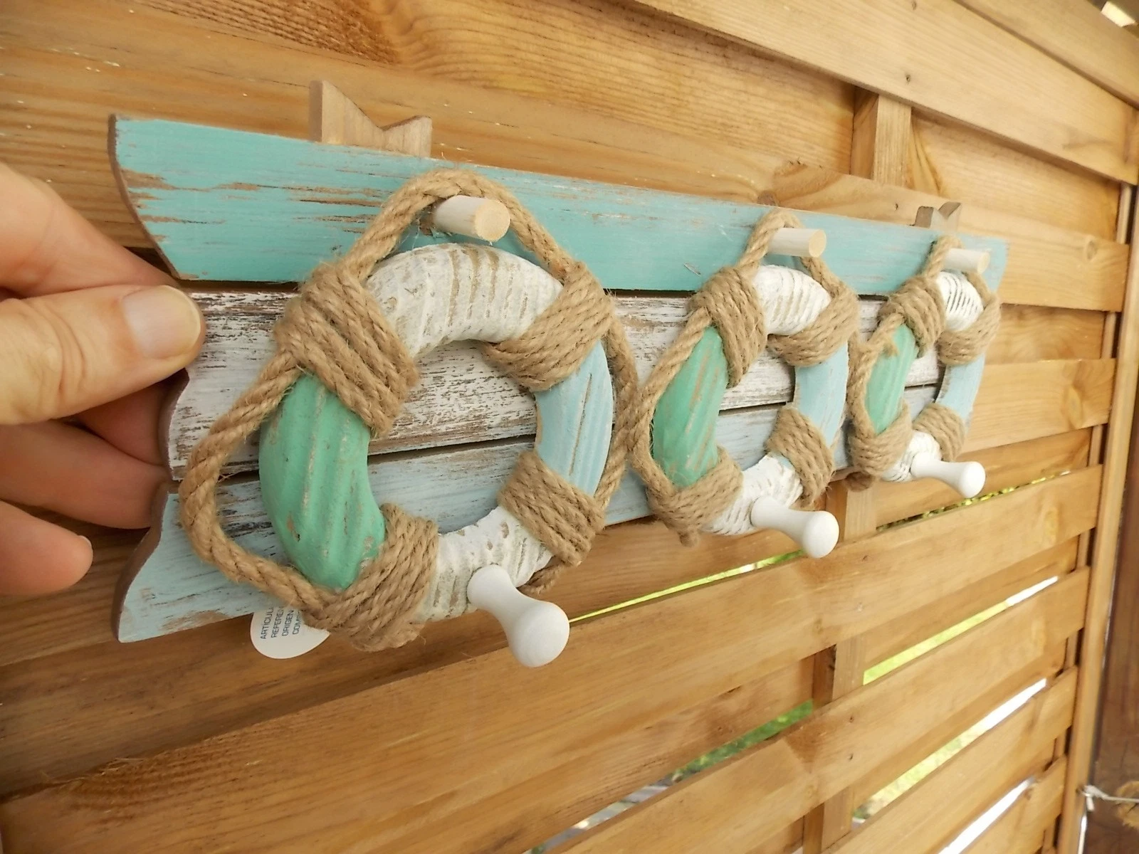 Porte manteaux marin 3 bouées ,en bois et cordage,neuf, longueur 45cm, hauteur 14cm,crochets a l’arriere pour fixation.